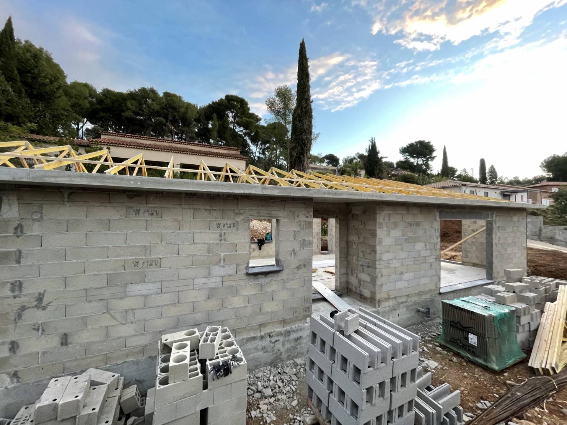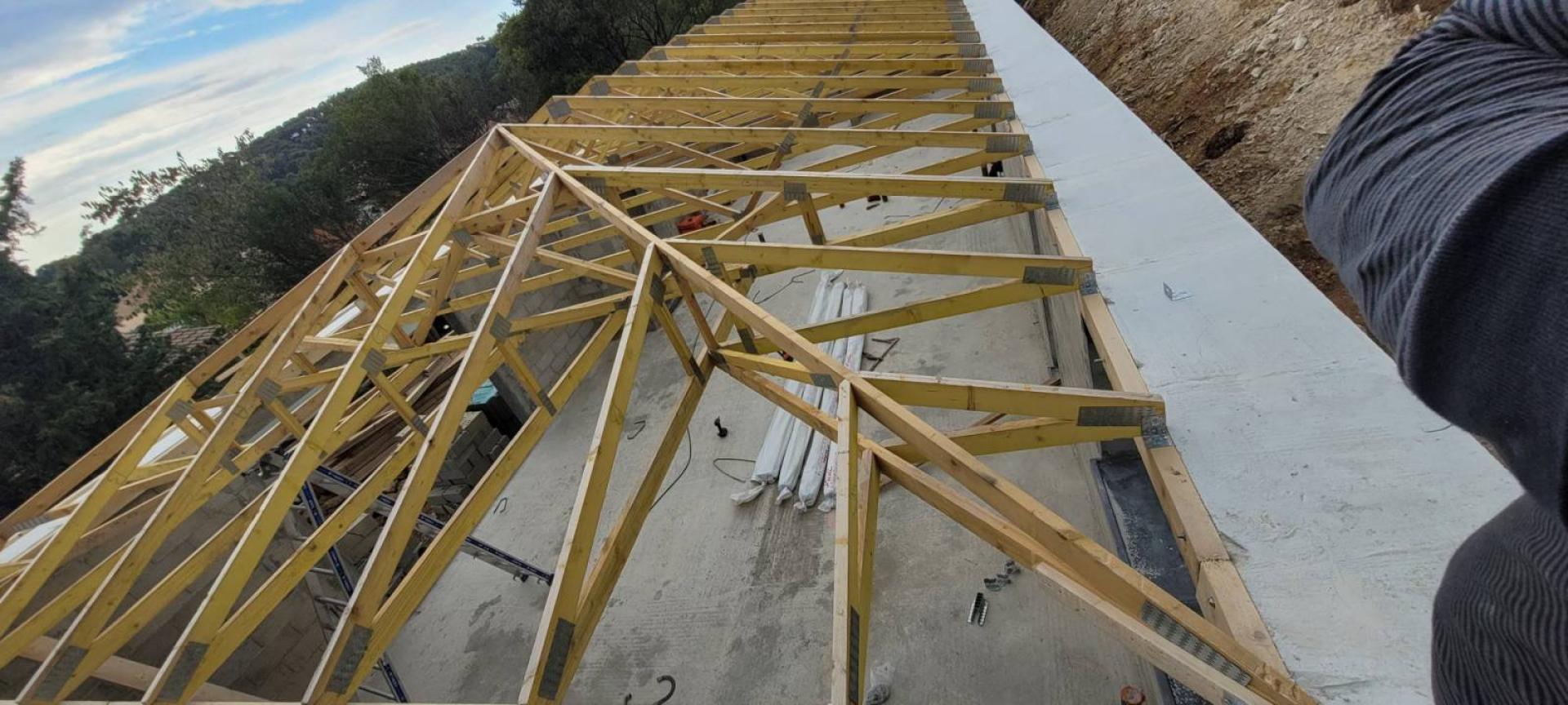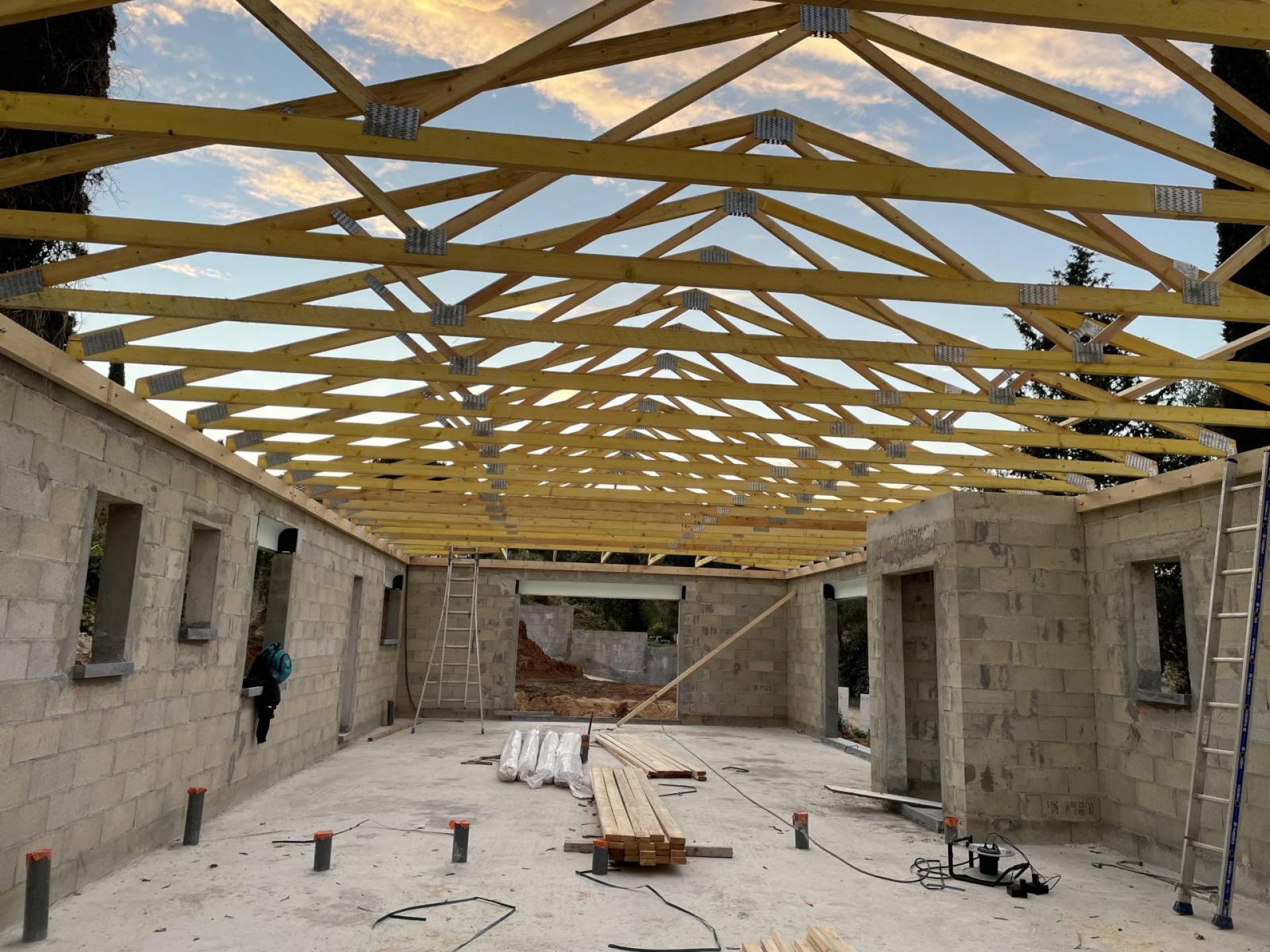 Voici la présentation de notre chantier près d'Evenos dans le Var. Nous avons, pour un de nos clients, créé et installé une charpente industrielle bois sur une maison neuve en construction.